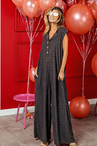 BiBi Checkered Cap Sleeve Wide Leg Jumpsuit with Pockets