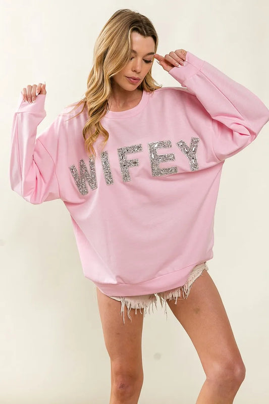 BiBi Wifey Glitter Letter Patches Loose Fit Sweatshirt