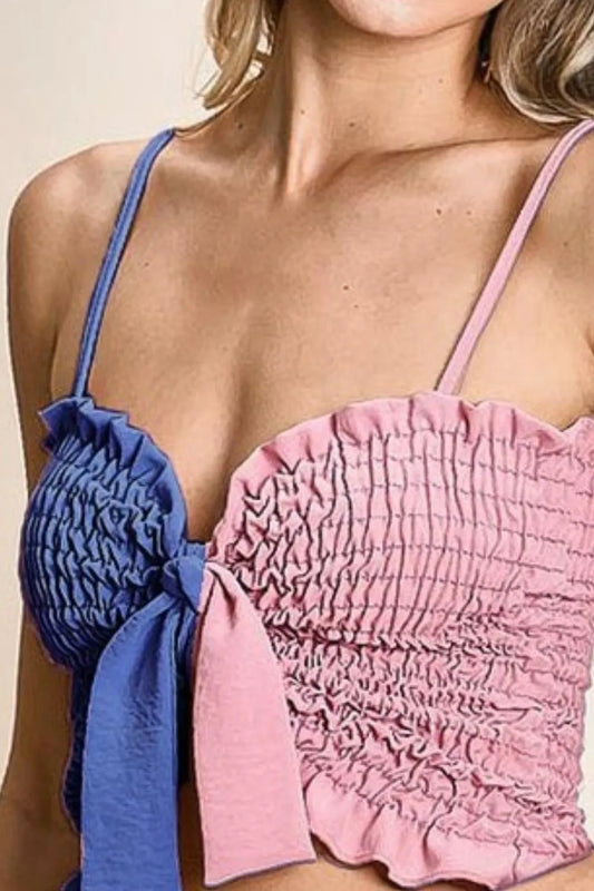 BiBi Woven Color Block Smocked with Ribbon Bra Top