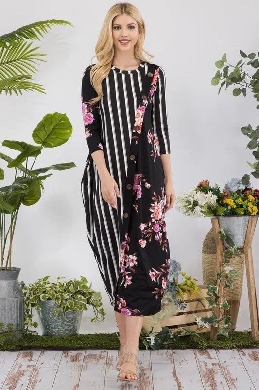 Celeste Full Size Stripe Floral Contrast Midi-Dress with Buttons Plus Size