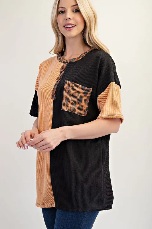 Celeste Full Size Two-Tone Knit Top with Leopard Accent Plus Size