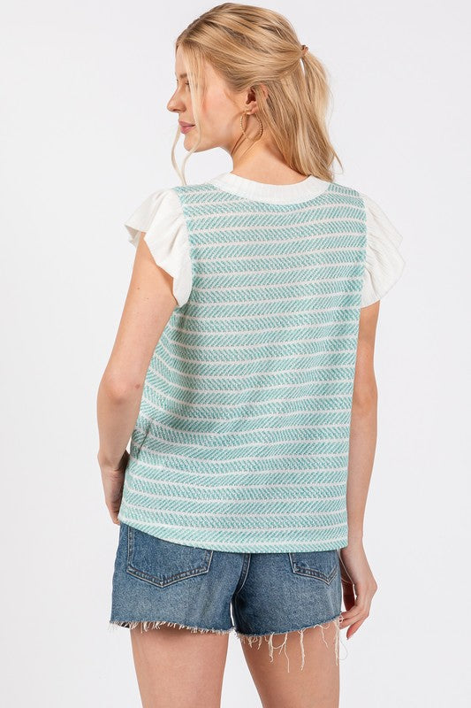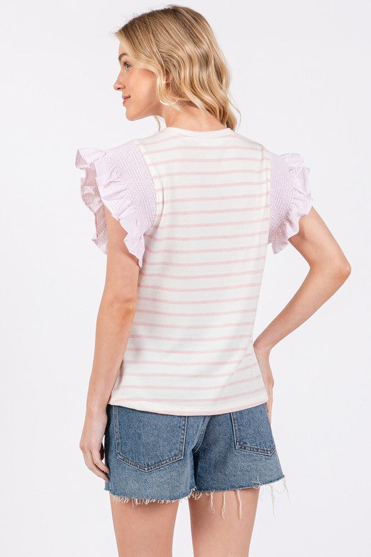 Ces Femme Contrast Striped Ruffled Cap Sleeve Blouse