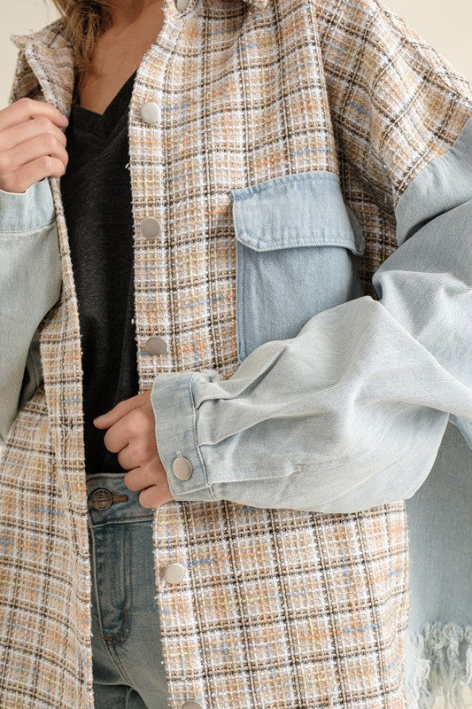 SWEET GENERIS Tweed Denim Shacket with Fringed Hem