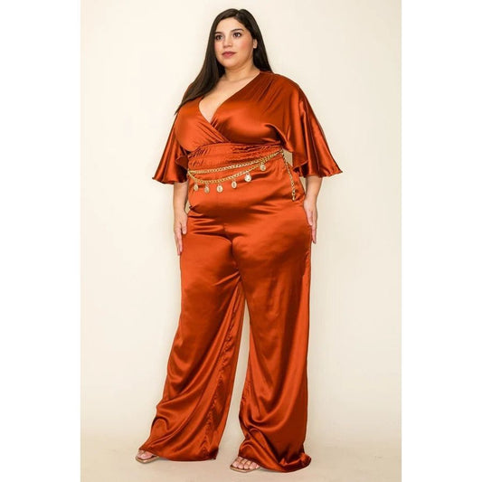 Plus-size Satin Wrap Front Short Sleeve Smocked Waist Jumpsuit