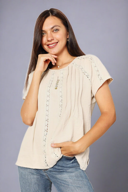 DOUBLE TAKE Pastel Yellow Crochet Buttoned Short Sleeves Top