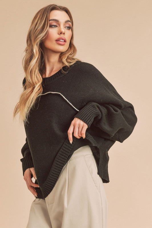 Umgee Women's Full Size Black Round Neck Long Sleeve Sweater/Plus Size