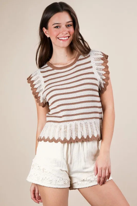 VERY J Women's Casual Mocha Ruffle Detail Striped Knit Sweater Top