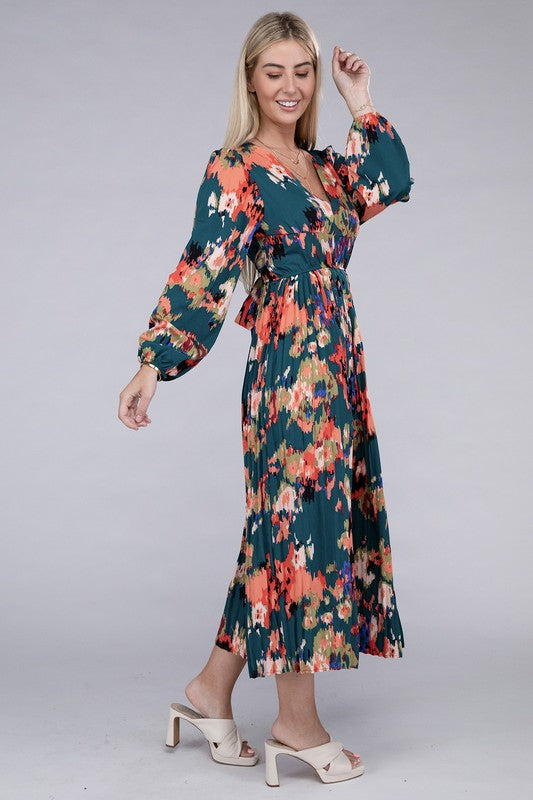 NUVI APPAREL Floral Satin Pleated Maxi Dress