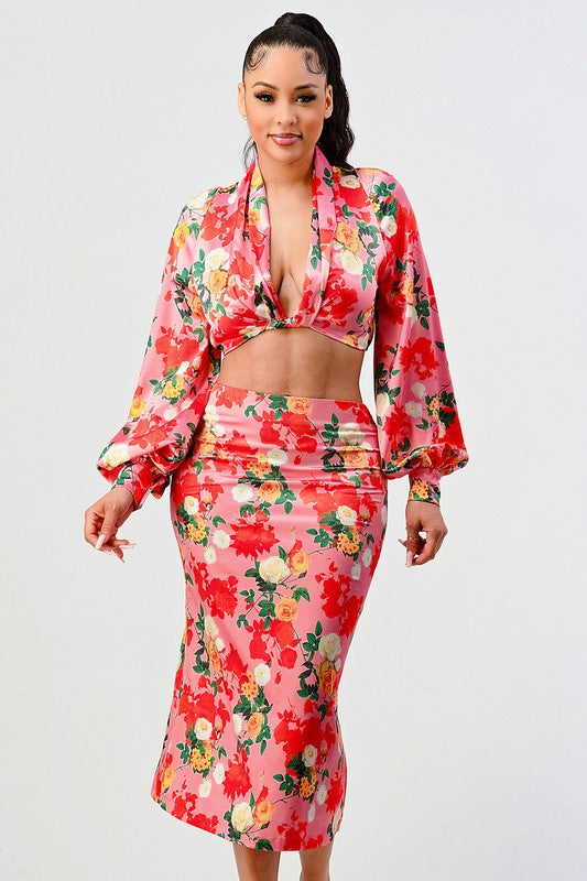 ATHINA Women's 2 Piece Rose Garden Vacation Set with Long Sleeve Crop Top and Mini Skirt