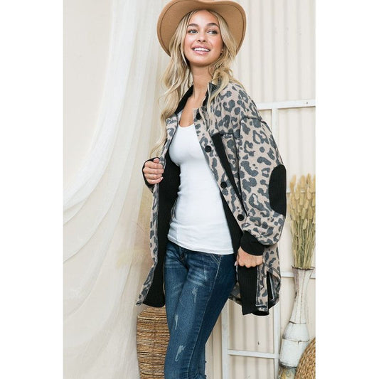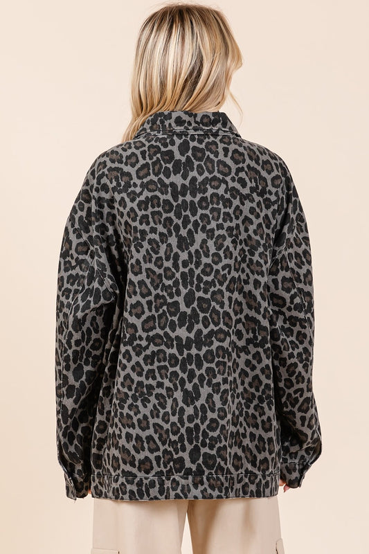 Mittoshop Black Leopard Button Up Oversized Denim Shacket with Breast Pockets