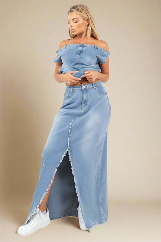 CLAUDE 2 Pieces Denim Off-the-Shoulder Top & Skirt Set