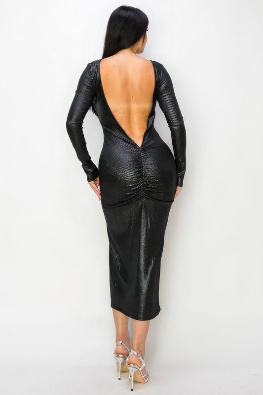 Sexy Black Ribbed Knit Metallic Backless Midi Party Dress