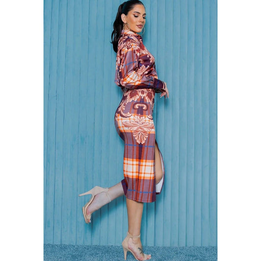 EG FASHION Plaid Balloon Sleeve Midi Dress