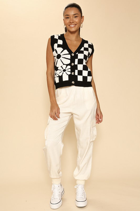 MISS SPARKLING Knitted Intarsia Flower & Checkered Vest