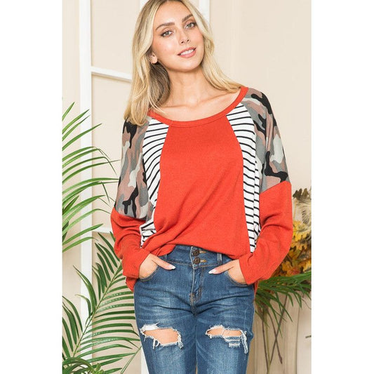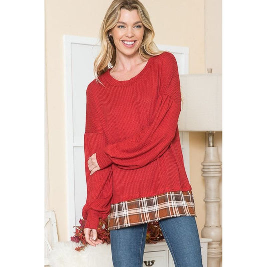 ORANGE FARM Balloon Sleeve Top with Plaid Print Contrast