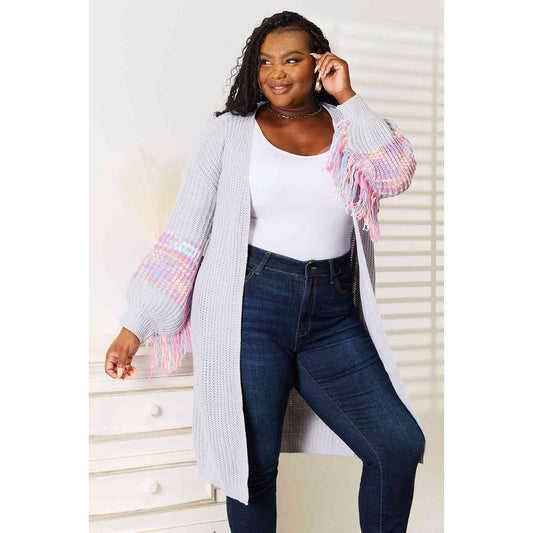 WOVEN RIGHT Fringe Sleeve Dropped Shoulder Cardigan