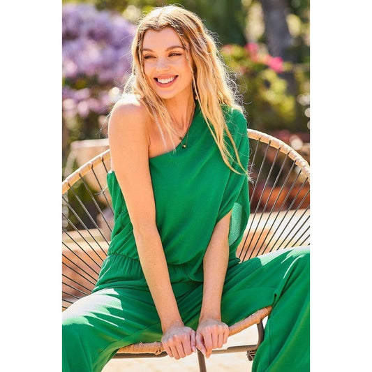 One Shoulder 3/4 Sleeve Unbalanced Waist Elastic Solid Pants Jumpsuit