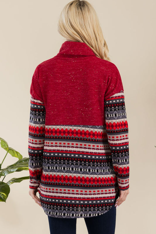 CELESTE Full Size Red Geometric Turtleneck Long Sleeve Top