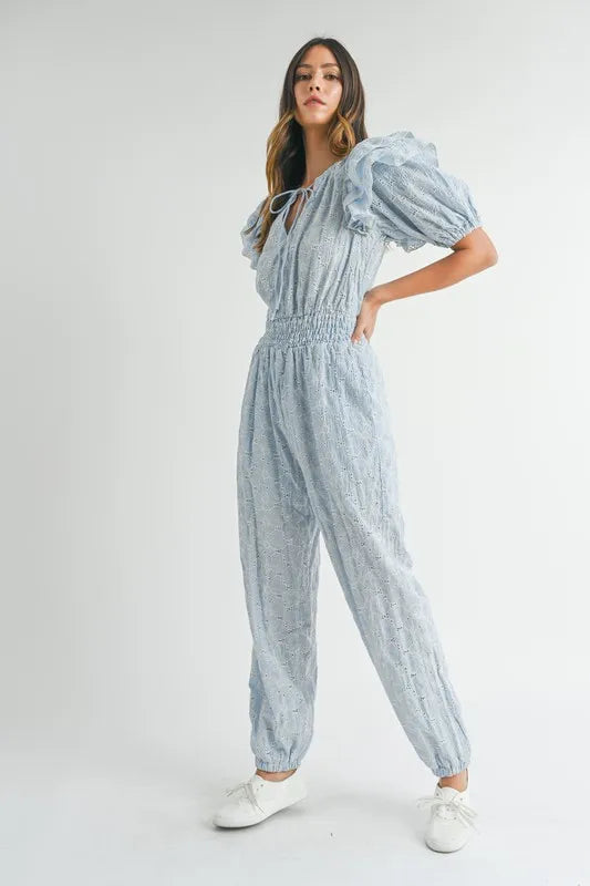 MABLE Women's Blue Eyelet Lace Ruffle Shoulder Summer Jumpsuit