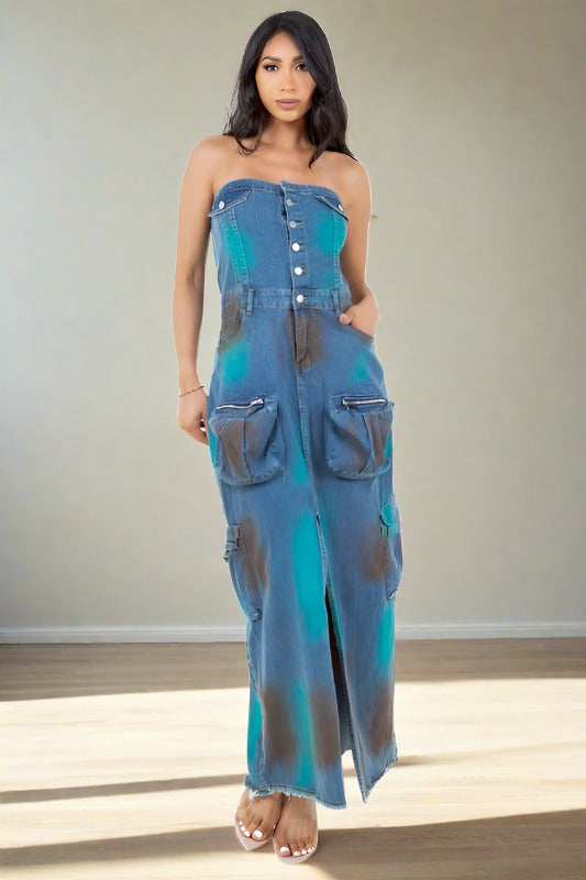 BY CLAUDE Strapless Maxi Cargo Denim Dress