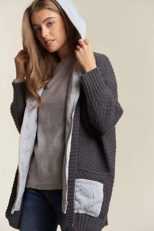 ADORA Women's Ivory Full Size Contrast Crochet Open Front Long Sleeve Cardigan