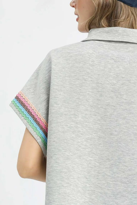 Umgee Contrast Trim Notched Puff Sleeve Blouse