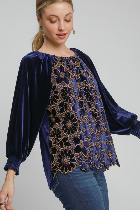 Umgee Full Size Floral Lace Velvet Raglan Sleeve Top Plus Size