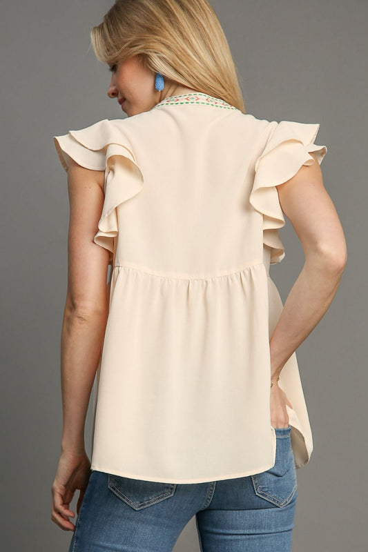 Umgee Full Size Embroidery Notched Double Ruffle Sleeve Blouse Plus Size