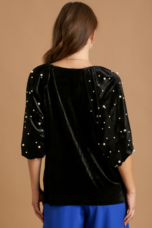Umgee Full Size Pearl Detail Velvet Round Neck Top Plus Size