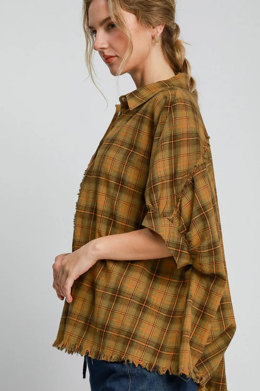 Umgee Full Size Raw Hem Plaid Collared Neck Half Sleeve Shirt Plus Size