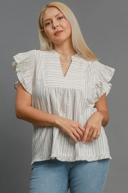 Umgee Full Size Textured Jacquard V-Neck Ruffle Cap Sleeve Blouse Plus Size