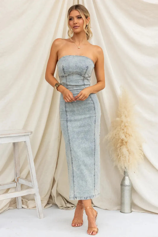 Washed Slit Back Tube Denim Dress