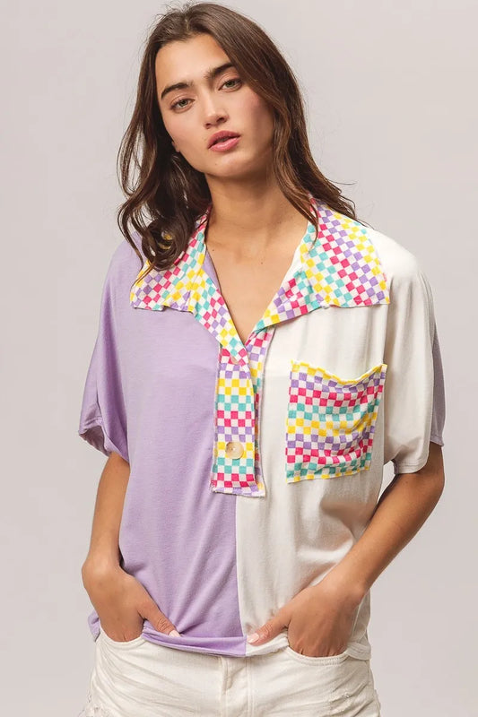 BiBi Color Block Knit with Multi Checker Contrast Top
