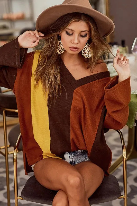 BiBi Brushed Thermal Color Block V-Neck Knit Top