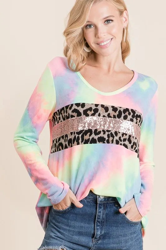 BiBi Tie Dye Deep U-neck Top with Leopard and Sequins