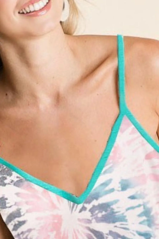 BiBi Tie Dye V Neck Top with Color Block Sleeves