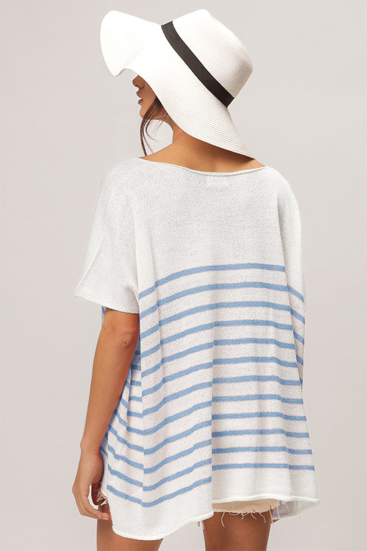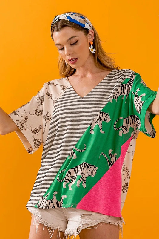 BiBi Tiger W Stripe Contrast Color Block V Neck Top
