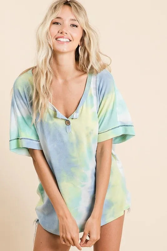 BiBi Tie Dye French Terry Top With Buttoned Placket