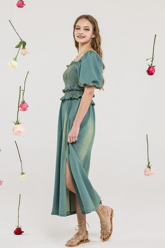 Plus Denim Off Shoulder Puff Slv Smocked Dress