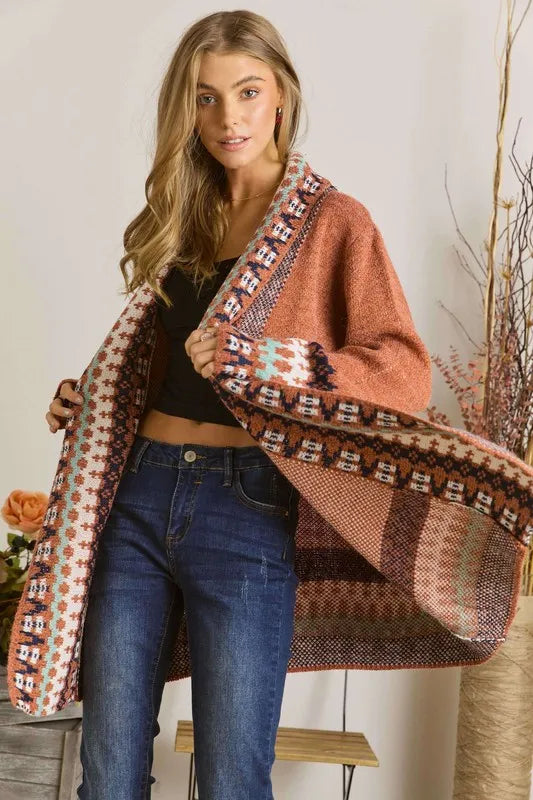 ADORA Full Size Tribal Border Sweater Cardigan Plus Size