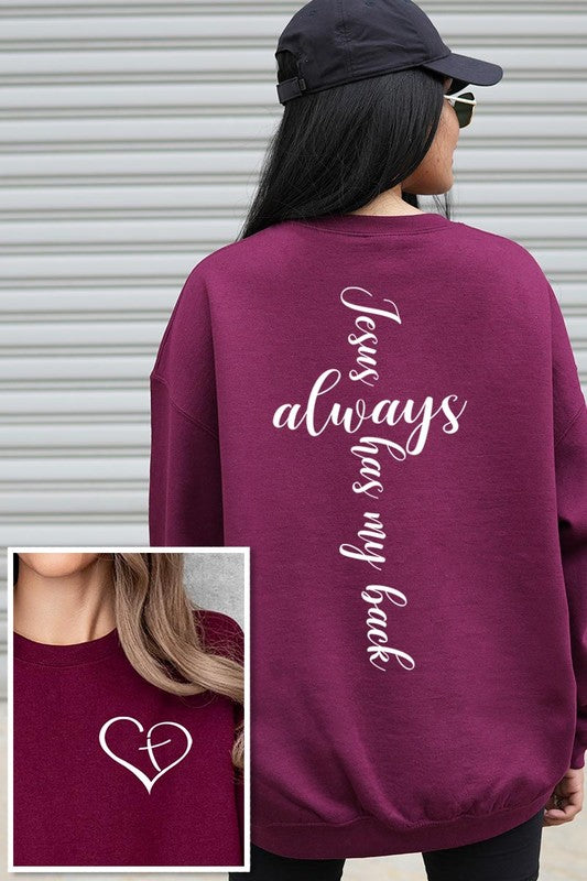 COLOR BEAR "Jesus Always Has my Back" Faith Front Back Graphic Fleece Sweatshirts