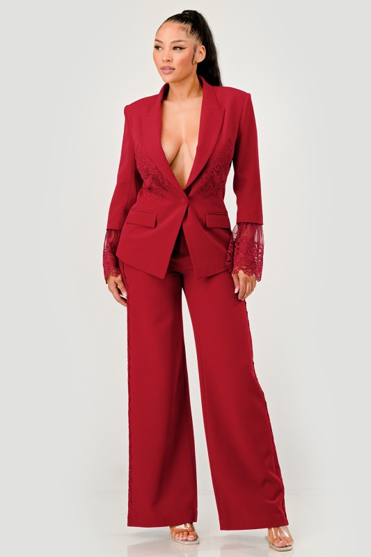 Turn heads in the Lace Majesty Set, a timeless ensemble that marries power dressing with delicate femininity. This set features a structured blazer adorned with subtle lace embroidery for a touch of romance, paired with dramatic lace cuffs that peek through the sleeves for added flair. The high-waisted wide-leg trousers are elegantly detailed with lace side panels, creating a cohesive and sophisticated look. Perfect for formal events, modern bridal wear, or stylish evenings, this ivory set exudes confidence and grace. Pair it with sleek heels and minimal jewelry to complete the look.