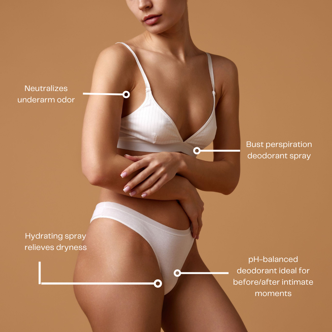 Safe for the vulva, underarms, or anywhere odor and dryness appear, the Intimate Spray offers a discreet, refreshing ritual that fits effortlessly into your everyday wellness routine.
