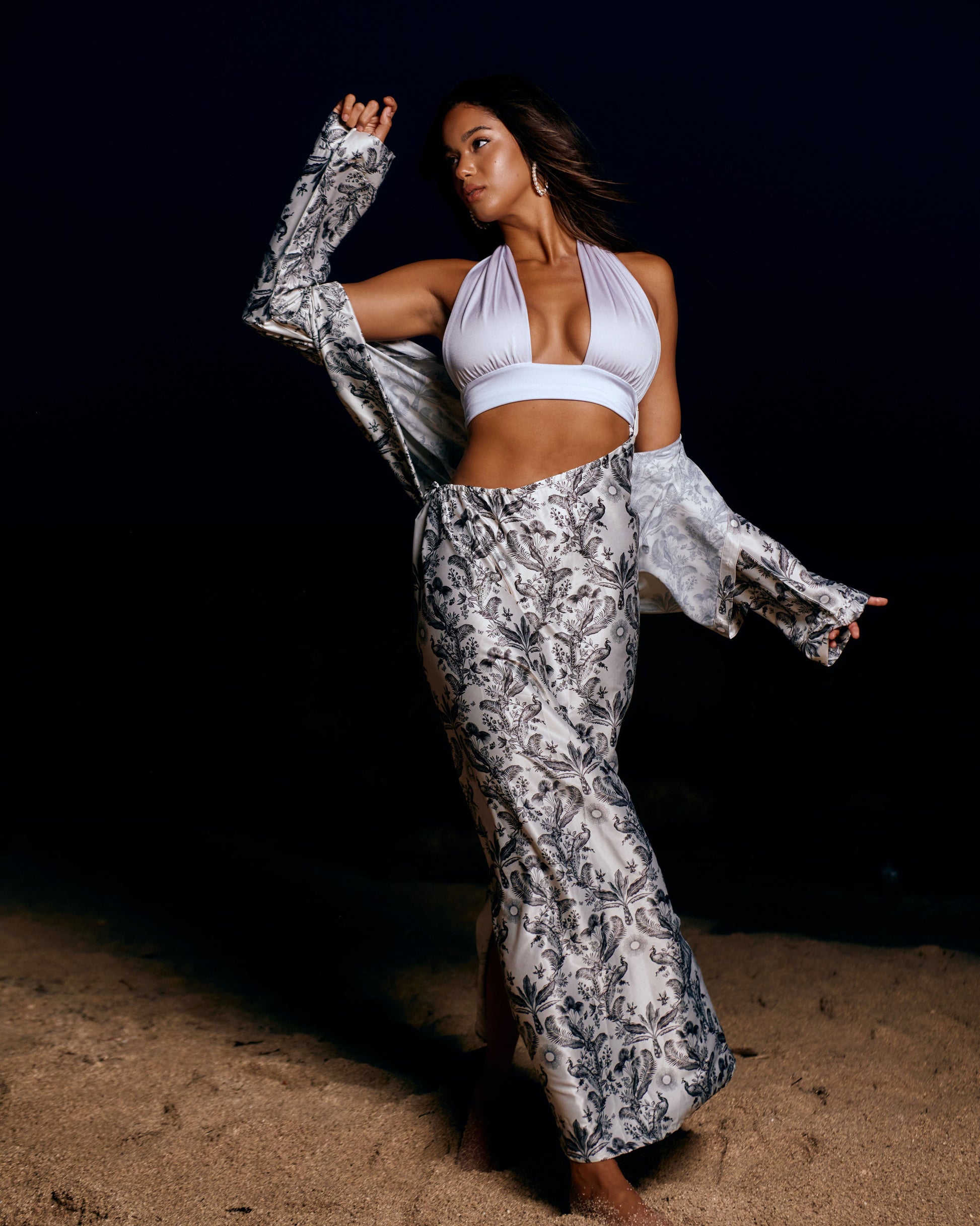 Introducing our exclusive French Toile Collection that embodies timeless elegance and sophisticated charm. This carefully curated collection is crafted from our custom designed stretch satin, offering a rich, lustrous finish that drapes beautifully against the skin. The intricate toile pattern on a delicate ivory floral ground is a modern twist on a classic design, with an air of refinement and style.
