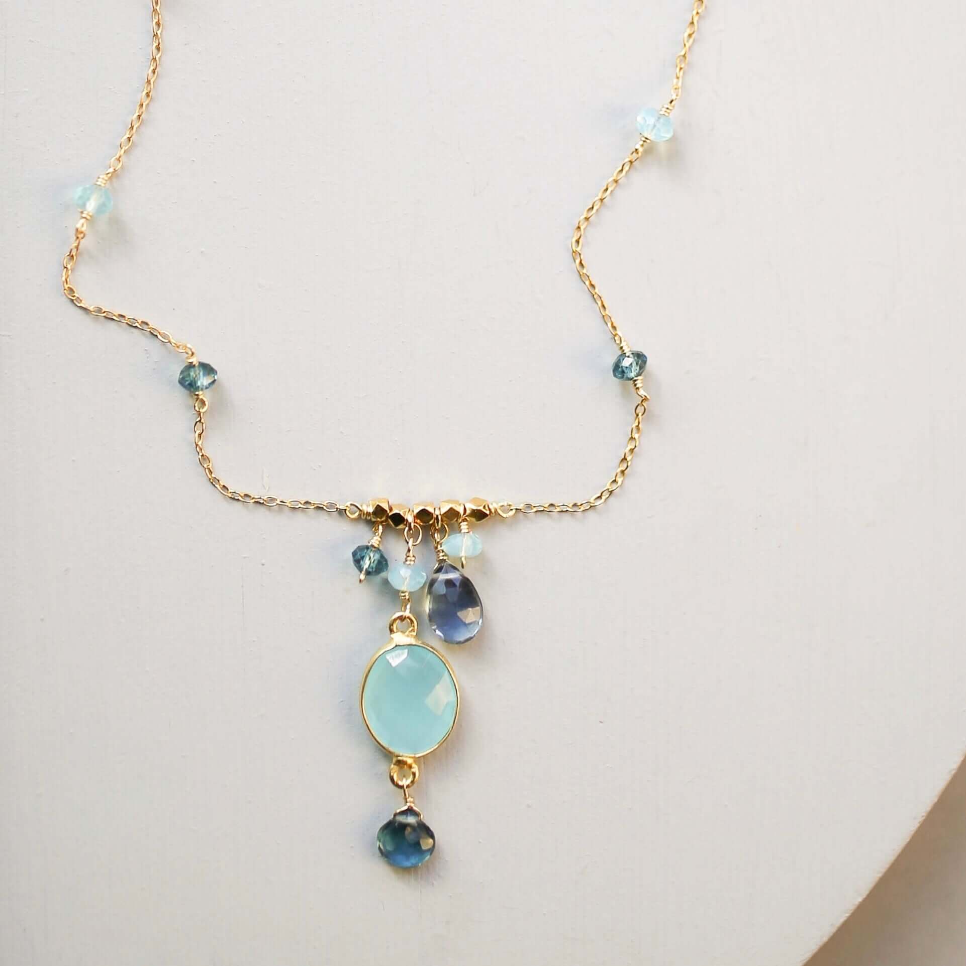 Jeweled necklace on a delicate gold chain. Beautiful blue chalcedony surrounded by iolite accents creates a one-of-a-kind necklace featuring an adjustable 16-18 inch length and a playful 2 inch pendant drop. Handmade with love in our NYC studio, this piece is plated with 14k gold to ensure lasting shine. Arrives ready to gift in an exclusive gift box