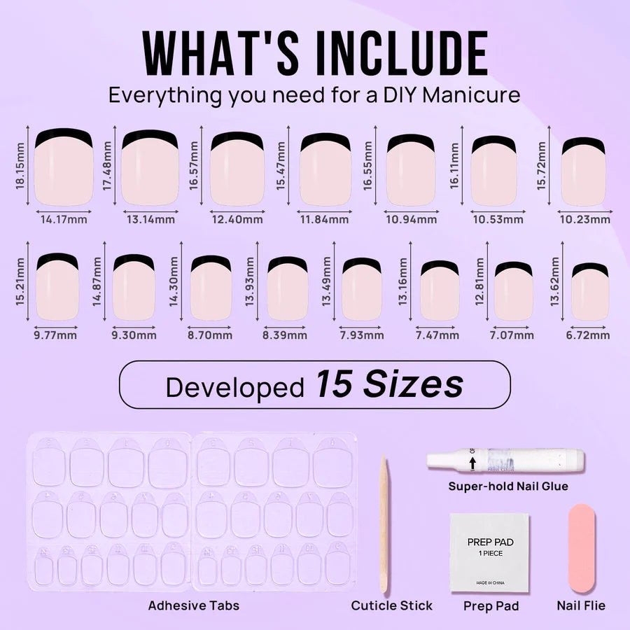 • Includes 30 tip nails, nail glue, nail file, alcohol pad, adhesive tabs,and nail removing/cuticle pusher tool
