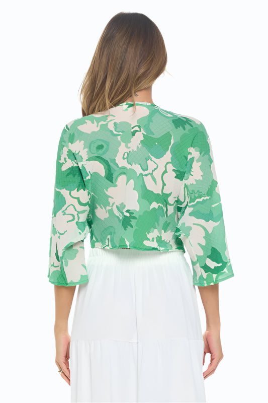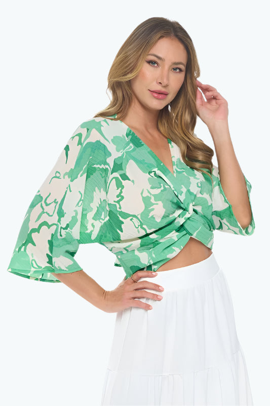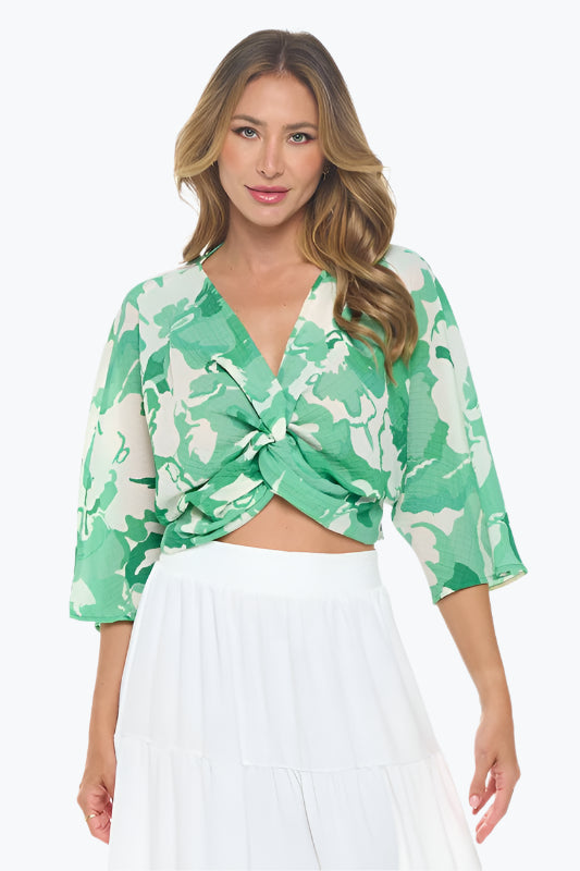 Renee C. Women's Kelly Green Floral Mid Sleeve Top with Front Twist