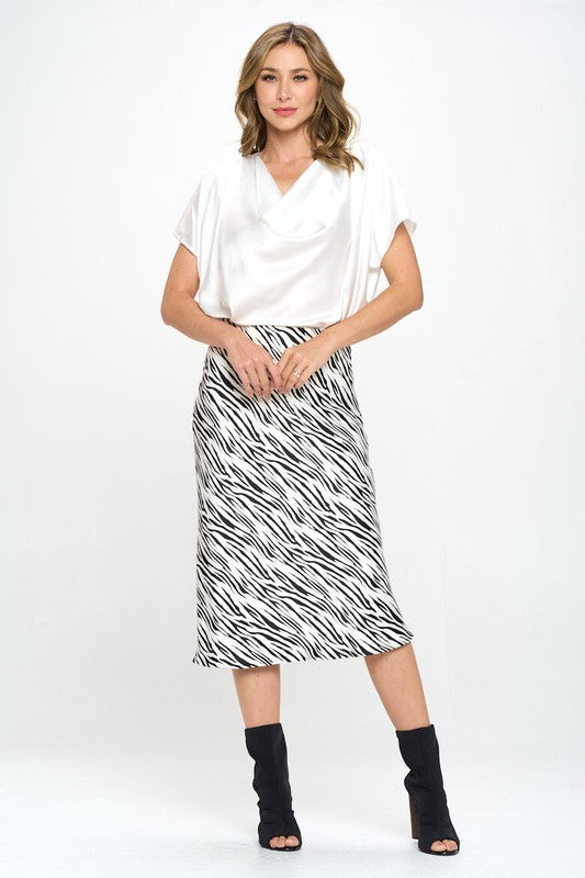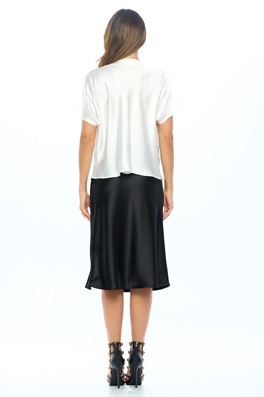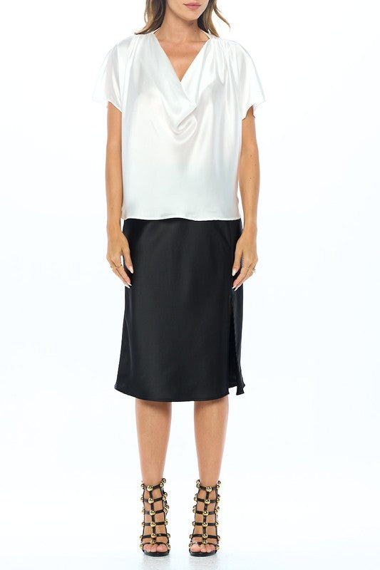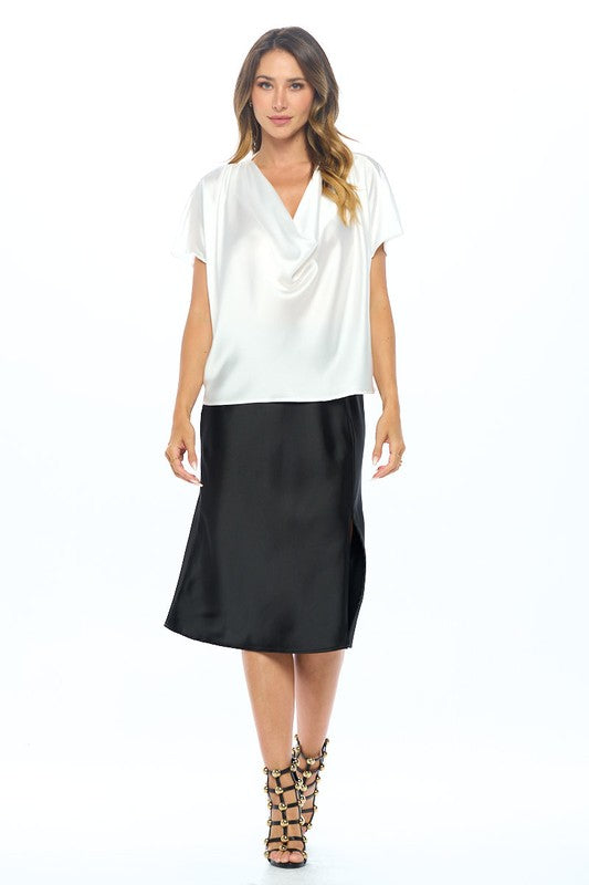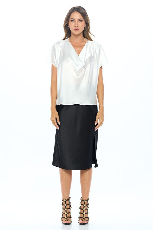 RENEE C. White Satin Cowl Neck Short Sleeve Blouse
